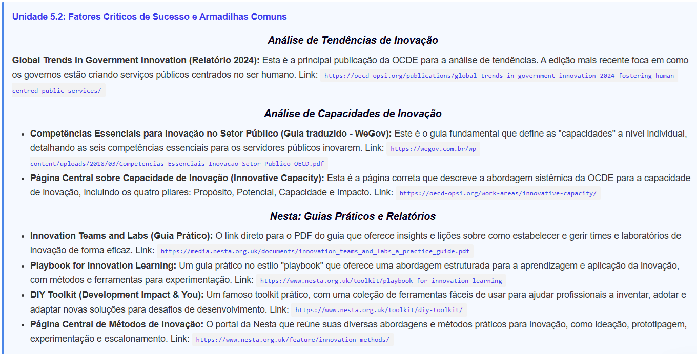 A cada módulo, disponibilizamos uma seleção criteriosa de artigos, livros e materiais digitais para aprofundar os conteúdos e qualificar sua atuação em Laboratórios de Inovação no Setor Público. Amplie sua perspectiva e converta conhecimento em resultados concretos.