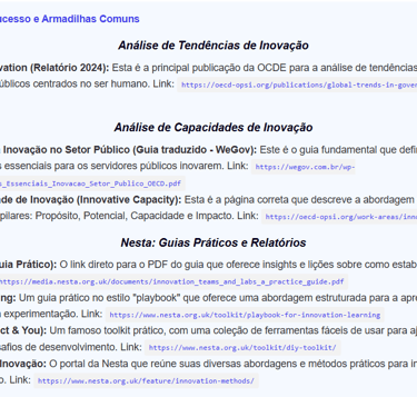 Metodologias e Abordagens de Inovação: Introduz as principais metodologias utilizadas em laboratórios de inovação. Abrange desde uma introdução geral às metodologias inovadoras, passando por técnicas de design thinking e abordagens centradas no usuário, até metodologias Lean e Ágil, relevantes para a condução de projetos inovadores no contexto público.